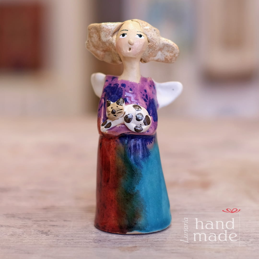 Ręcznie robiona ceramiczna figurka aniołka z kotkiem.