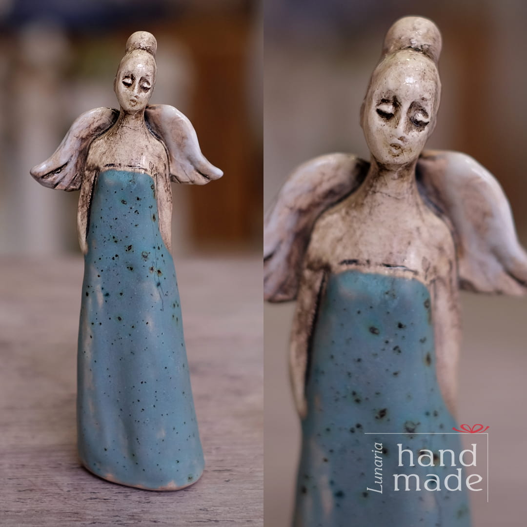 Ręcznie robiona ceramiczna figura anioła w niebieskiej sukience.