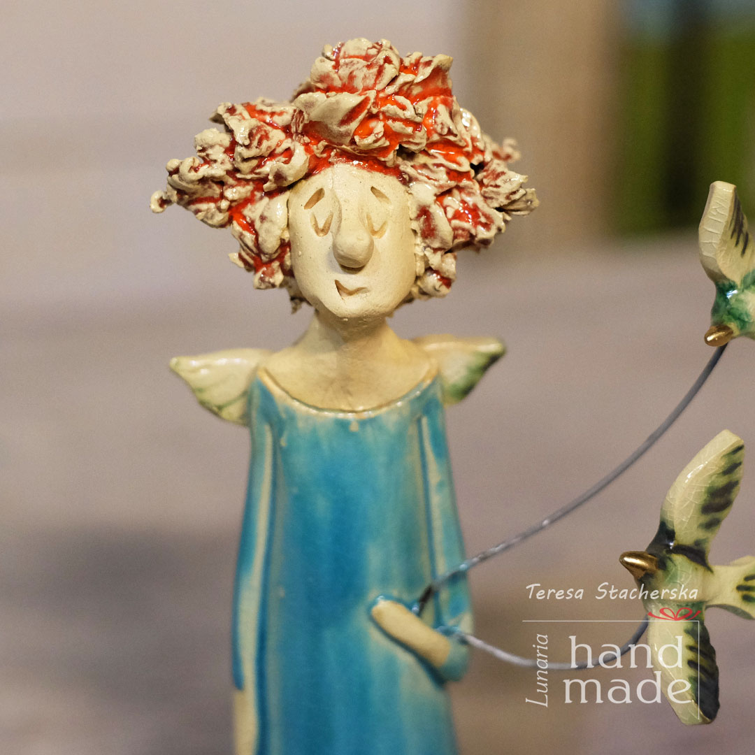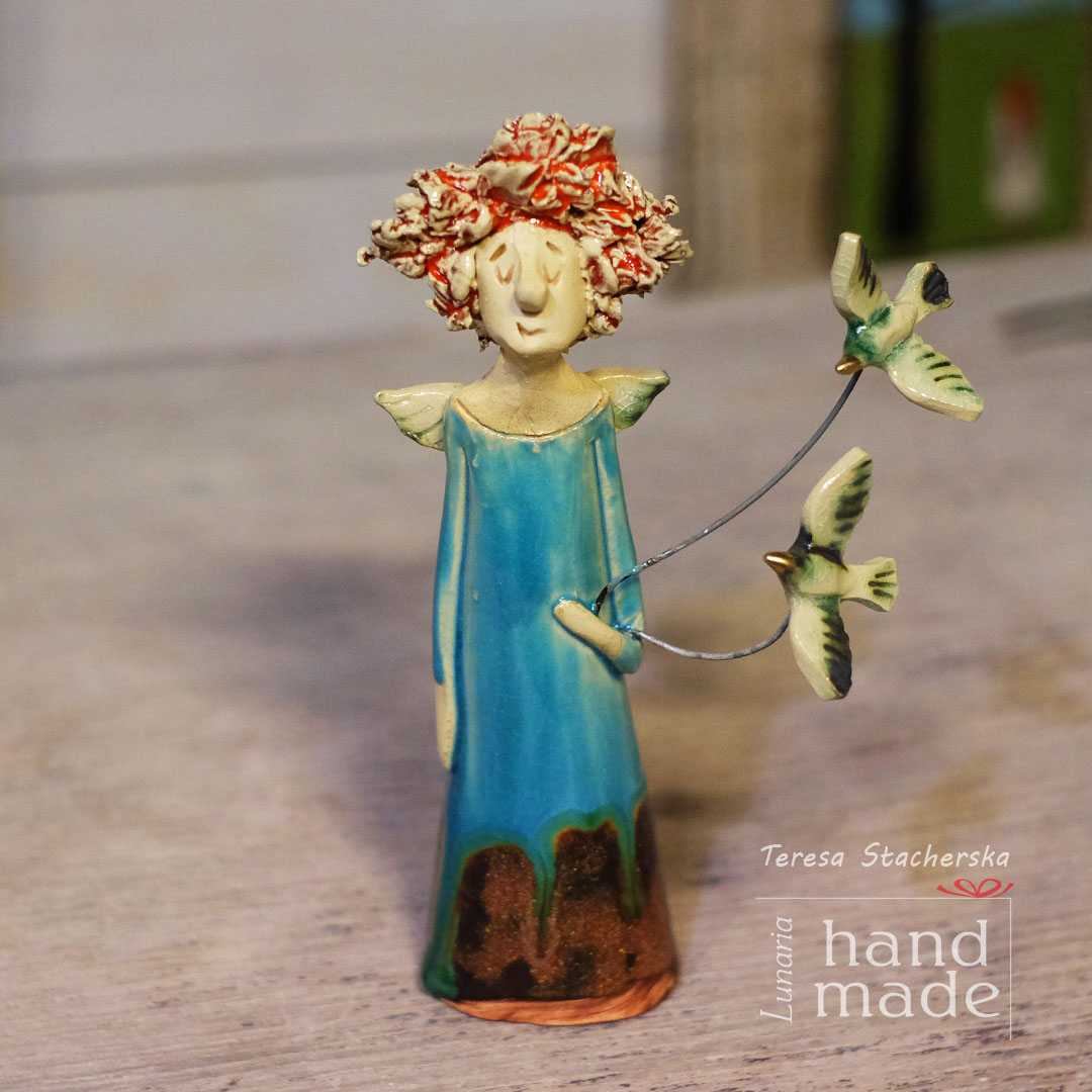 Ręcznie robiona ceramiczna figurka aniołka z ptaszkami. Wykonany z gliny, stojący anioł , podwójnie wypalany i szkliwiony. Mały rozmiar anioła pozwoli wykorzystać go, jako dekoracja każdego, nawet bardzo małego wnętrza. Świetnie będzie pasować do dziecięcego pokoju, do sypialni na komodę a nawet do kuchni. Dzięki stonowanej kolorystyce idealnie skomponuje się z roślinami domowymi, tworząc oryginalną aranżację w stylu Boho, jak i tradycyjnym. Ożywi każdą przestrzeń. Może być również doskonałym pomysłem na prezent dla kobiety na wiele okazji.