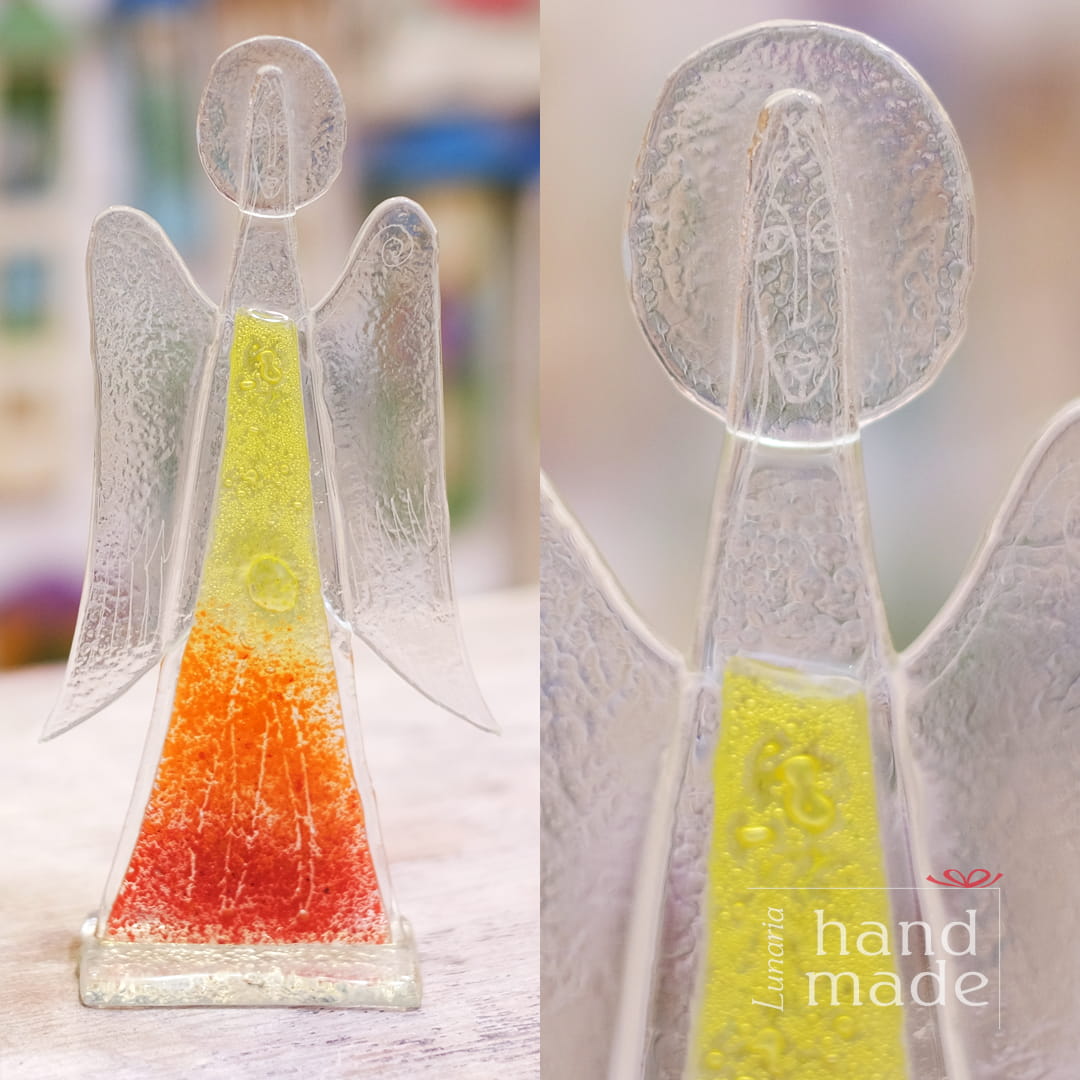 Ręcznie robiony szklany anioł w pomarańczowo-żółtym kolorze.