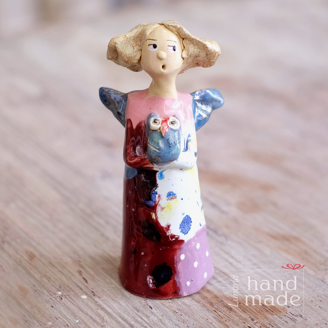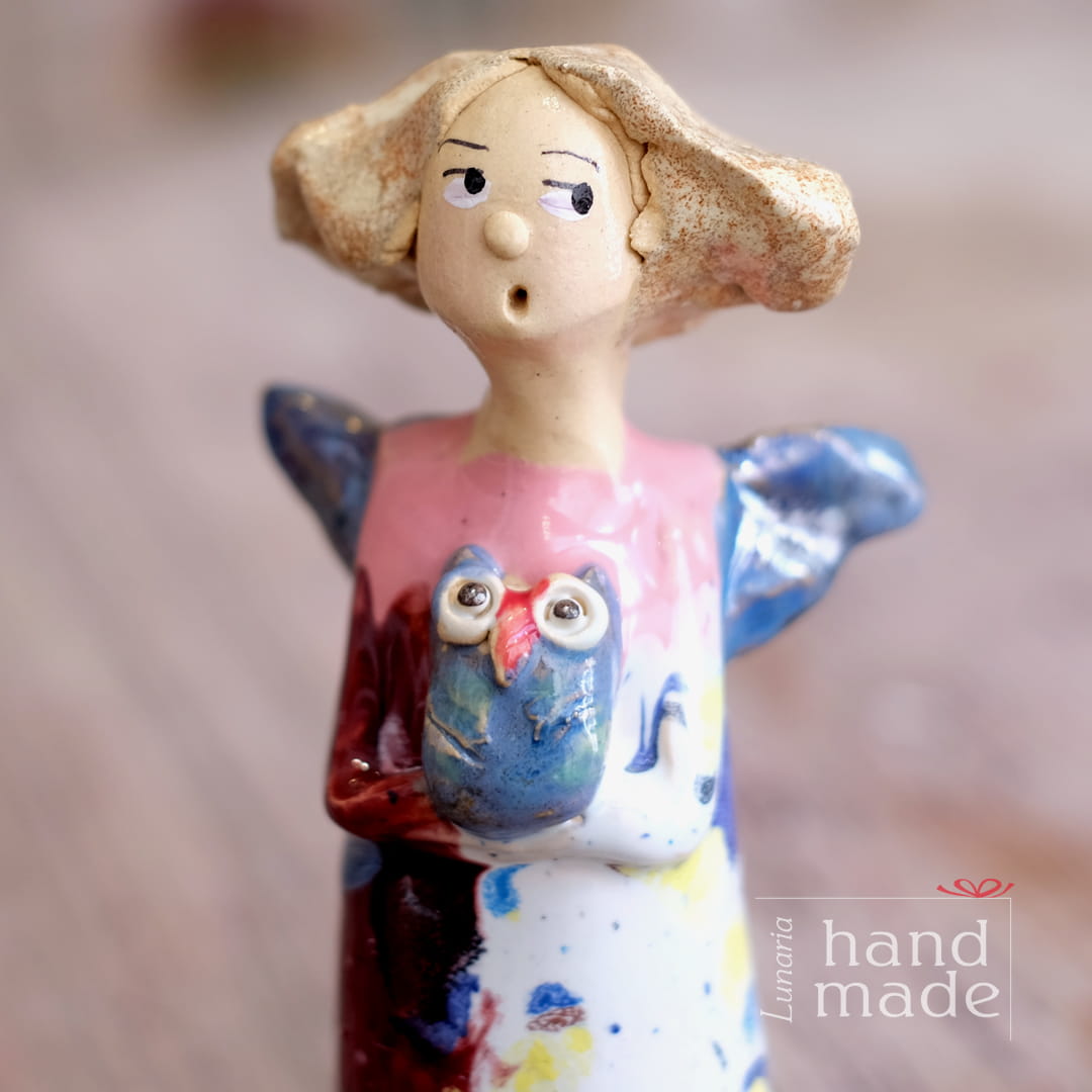 Ręcznie robiona ceramiczna figurka aniołka z sową. Anioły z gliny wykonane ręcznie w zaprzyjaźnionej pracowni ceramiki, nieco zwariowane, zawsze wesołe, przywołujące uśmiech na twarzy u największych ponuraków! Ceramiczny anioł, postrzegany obecnie bardziej jako dobry duszek niż postać związana z religią, jest zawsze mile widziany jako wyjątkowy prezent dla mamy, prezent dla taty, a właściwie dla każdego, komu życzymy dobrze. Mała figurka sowy, to symbol mądrości. Czego więcej można chcieć dla kogoś bliskiego, niż to by miał swojego dobrego anioła i mądrość?