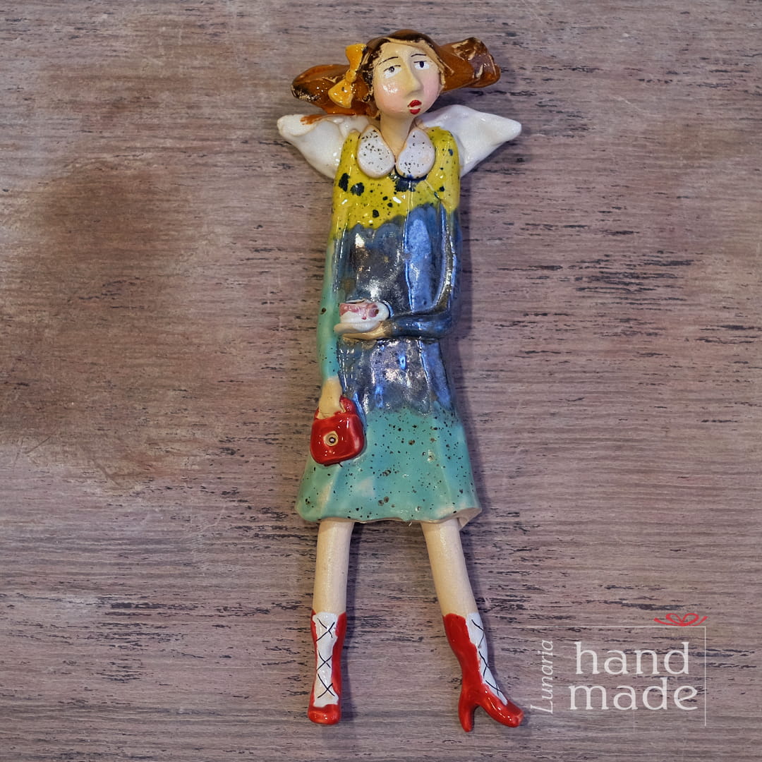 Ręcznie robiona ceramiczna figurka anioła z filiżanką i torebką.