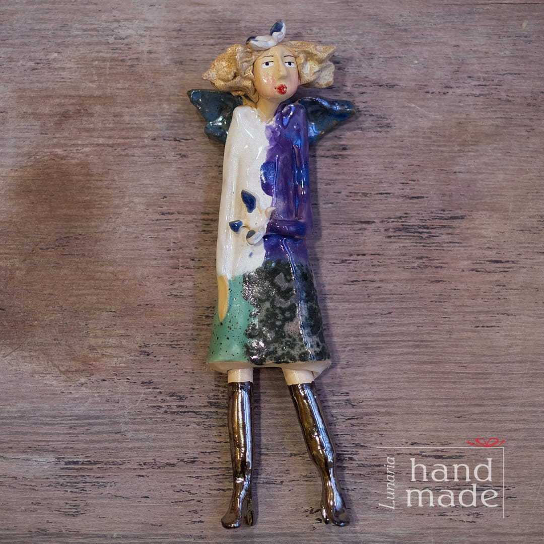 Ręcznie robiona ceramiczna figurka anioła z ptaszkami.