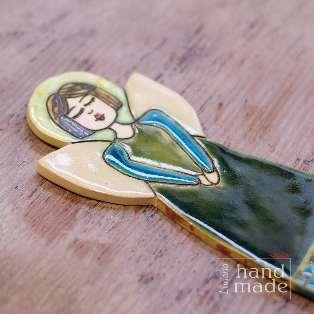 Ręcznie robiony ceramiczny aniołek w zielono-niebieskiej sukience.