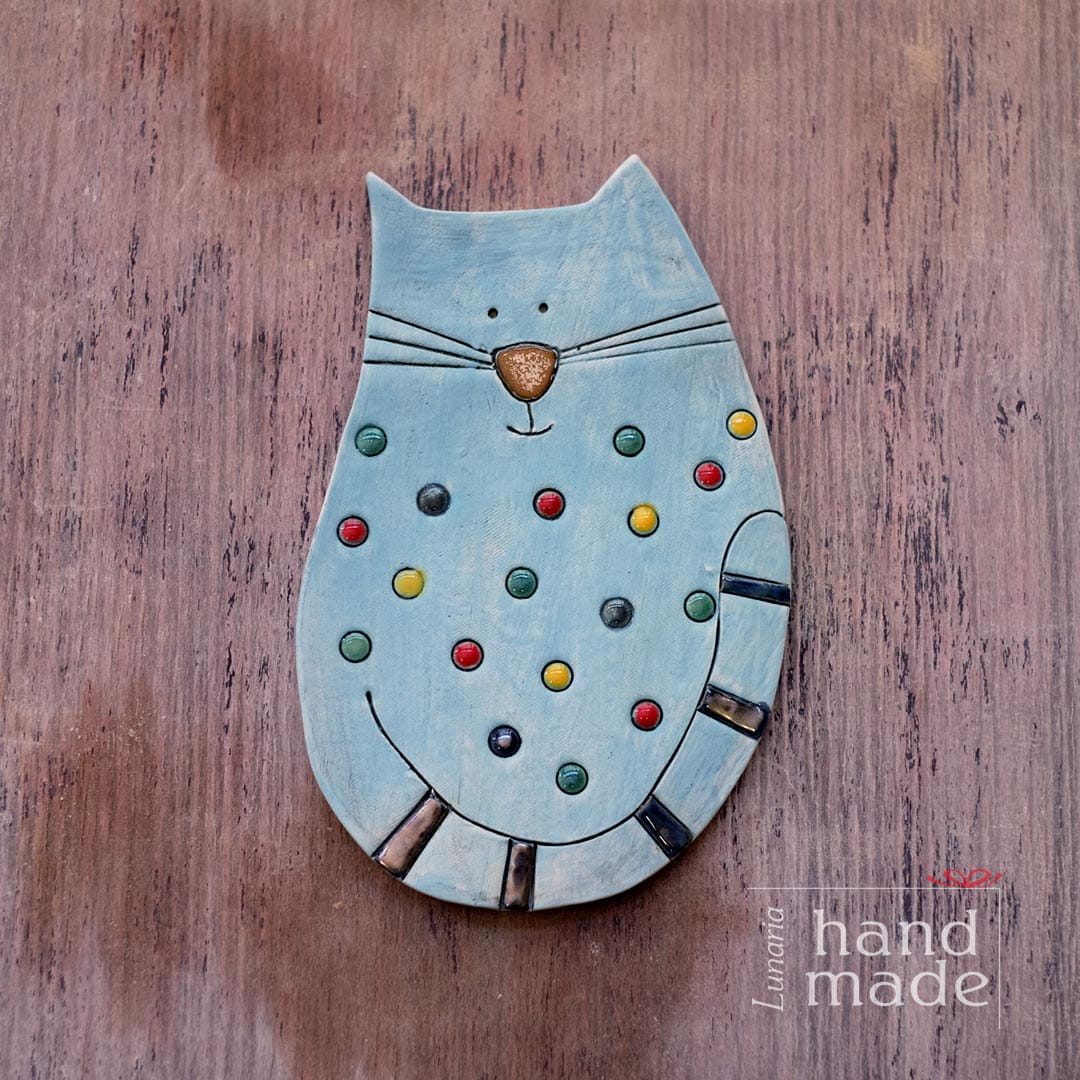 Niebieski ceramiczny kot w kropki. Wykonany w krakowskiej pracowni.