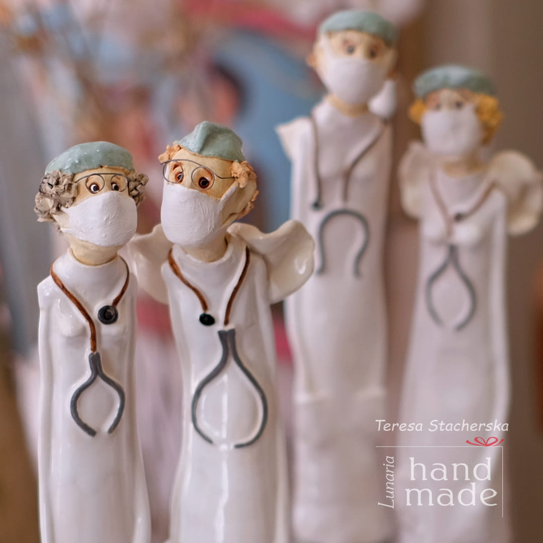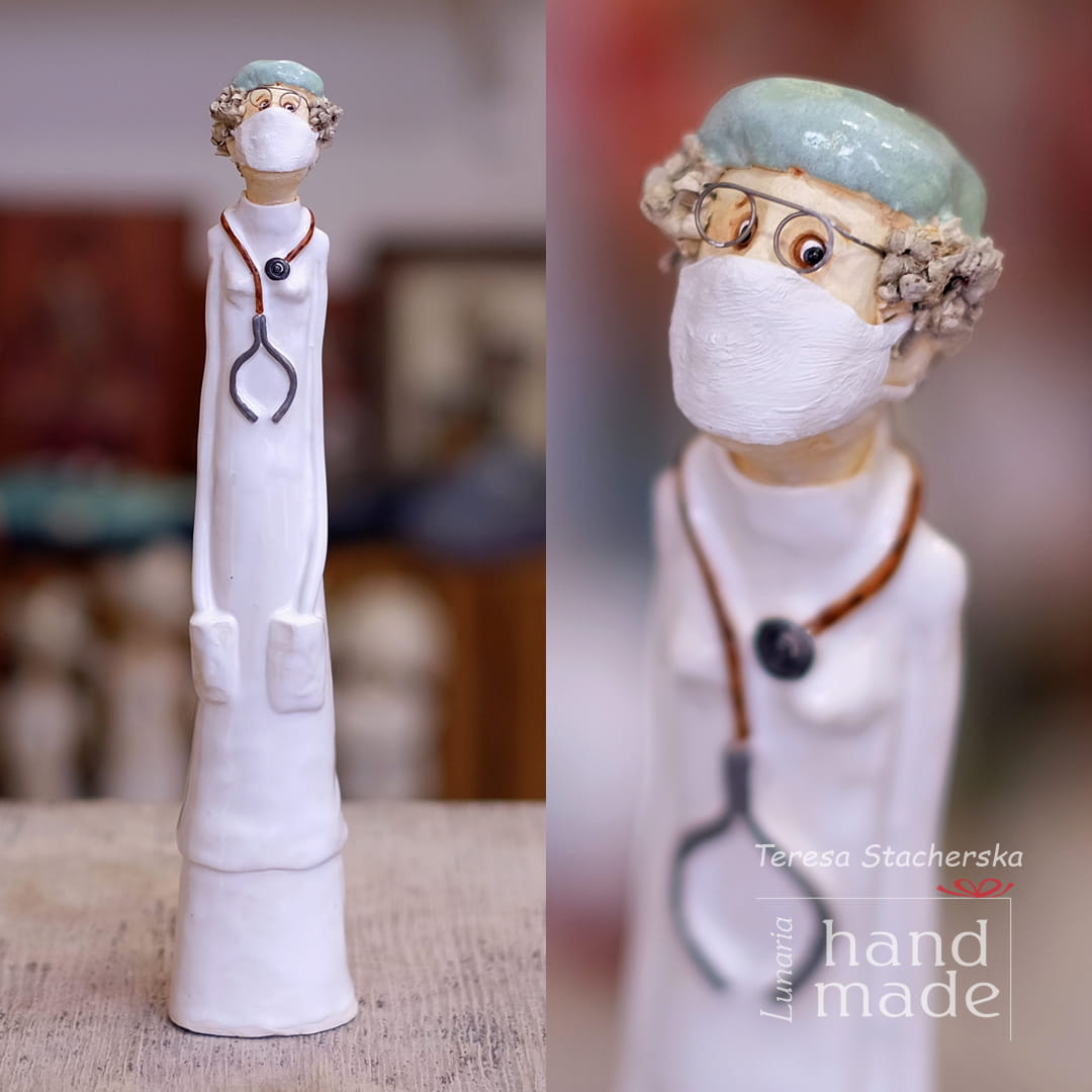 Ręcznie robiona ceramiczna figurka lekarki w maseczce.