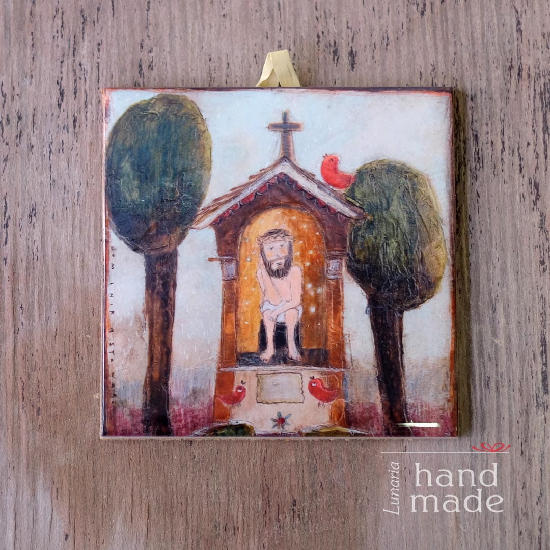 Kafel może być powieszony na ścianie, lub pełnić funkcję podstawki, np. pod kubek. Jest odporny na wysokie temperatury. Spód podklejony korkiem. Zawieszka z rafii.