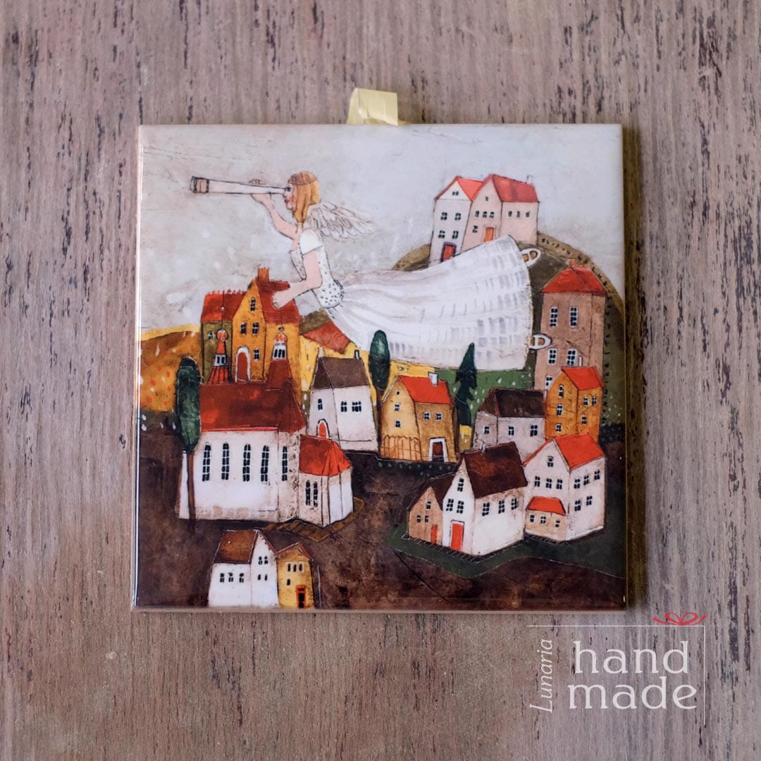 Kafel może być powieszony na ścianie, lub pełnić funkcję podstawki, np. pod kubek. Jest odporny na wysokie temperatury. Spód podklejony korkiem. Zawieszka z rafii.