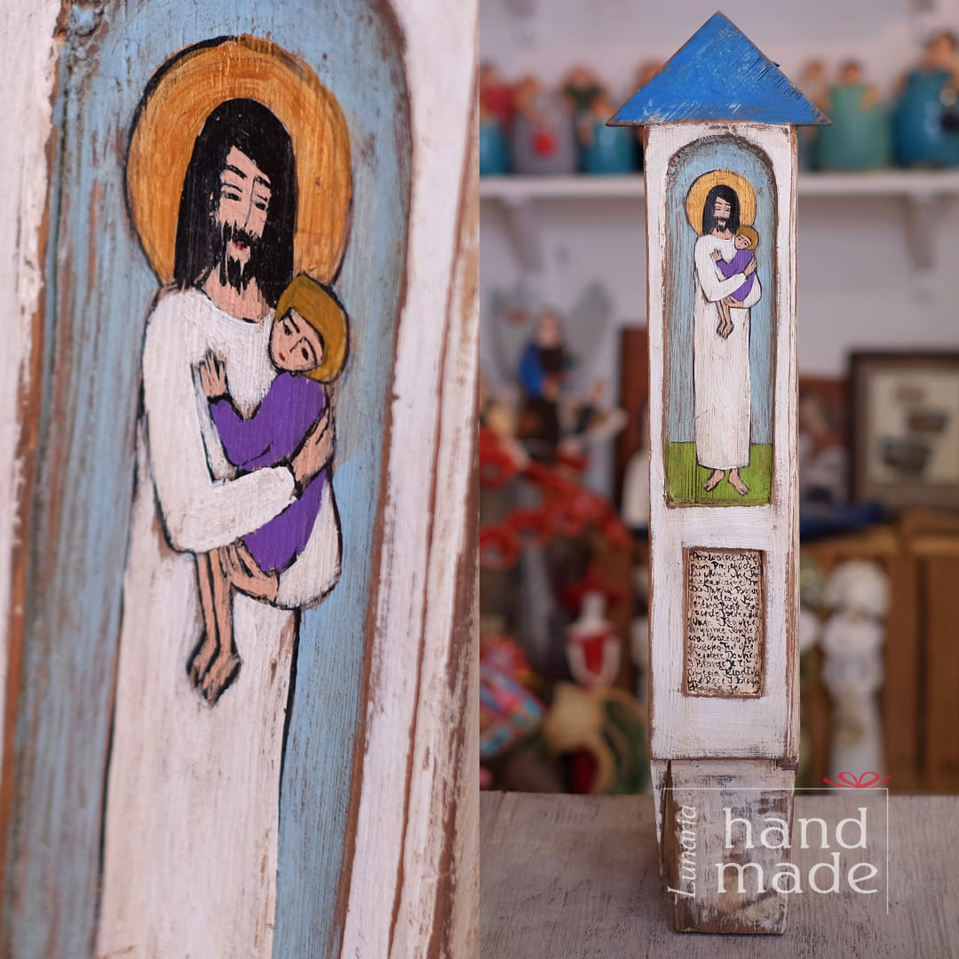 Ręcznie robiona drewniana kapliczka przedstawiająca Jezusa z dzieckiem na rękach.