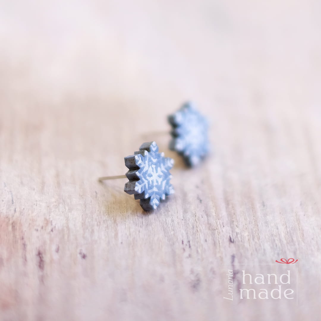 Ręcznie robione drewniane kolczyki śnieżynki ze sztyftami ze stali chirurgicznej.