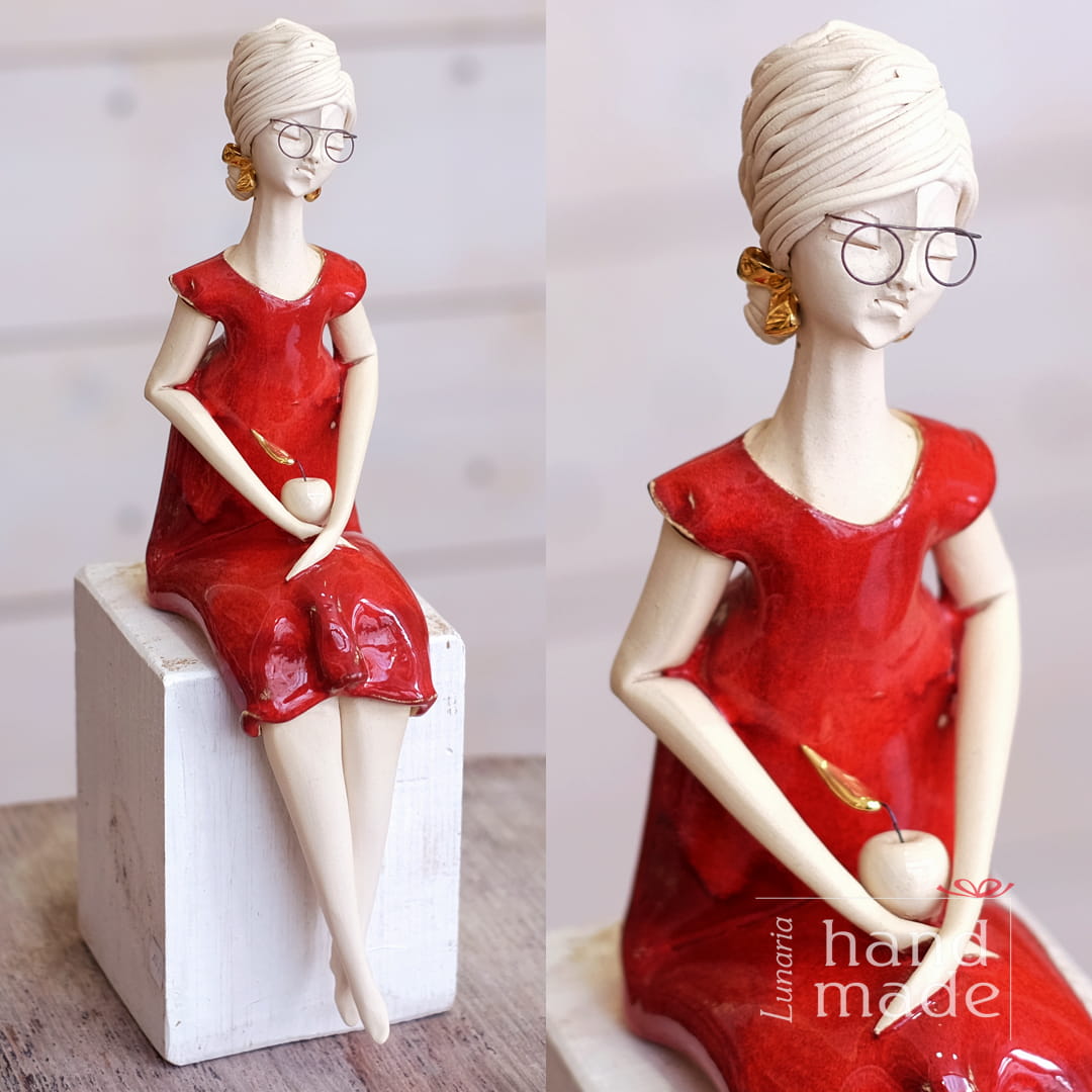 Siedząca dama czerwona - jabłko i okulary - "M"