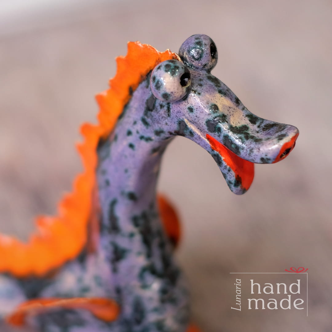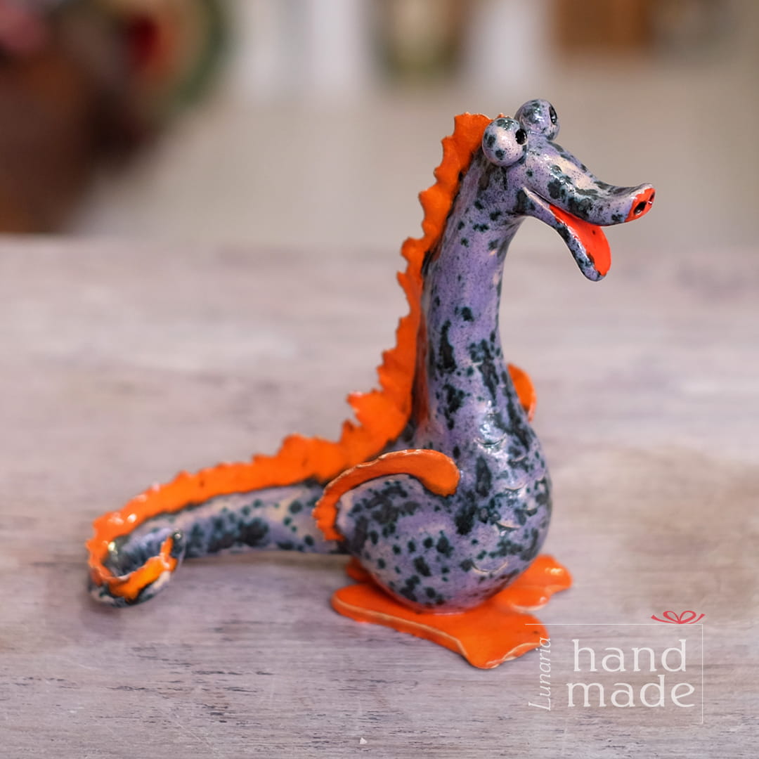 Ręcznie robiony ceramiczny smok wawelski w kolorze filetowo-pomarańczowym.