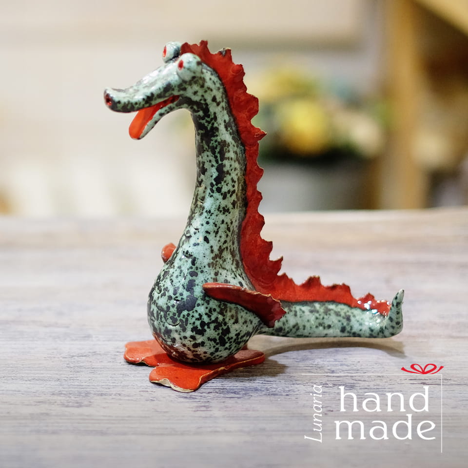 Ręcznie robiony ceramiczny smok wawelski w kolorze zielono-czerwonym.