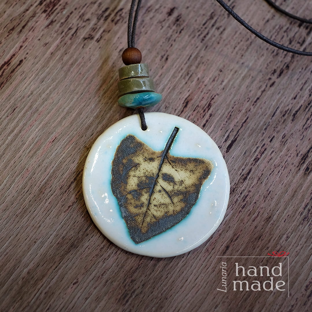 Ręcznie robiony ceramiczny wisior z motywem liścia.