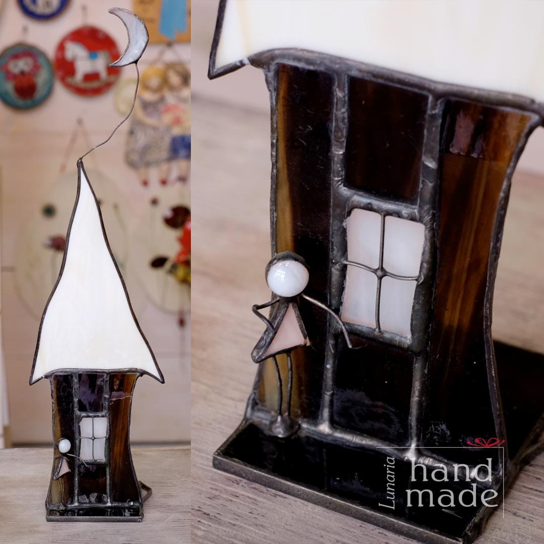 Domek na świeczkę wykonany ręcznie ze szkła witrażowego.